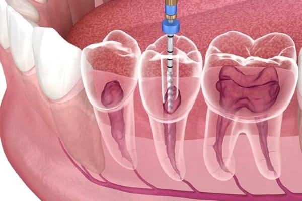 The canal is filled and sealed. A metal post may be added for structural support or to retain restorative materials.